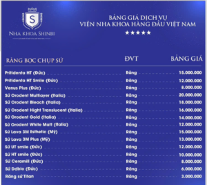 Nha khoa Shinbi cam kết sử dụng 100% vật liệu sứ nhập khẩu chính hãng từ Đức, Mỹ, Thụy Sĩ. Các dòng sứ như Venus plus, UT Smile, Titan hoặc Lava Plus đều có độ bền, tính thẩm mỹ và tương thích sinh học cao, đảm bảo an toàn tuyệt đối cho sức khỏe răng miệng. Khách hàng có thể tham khảo bảng giá dưới đây: